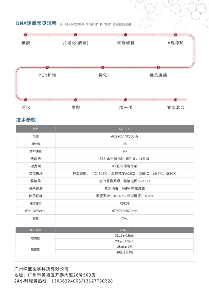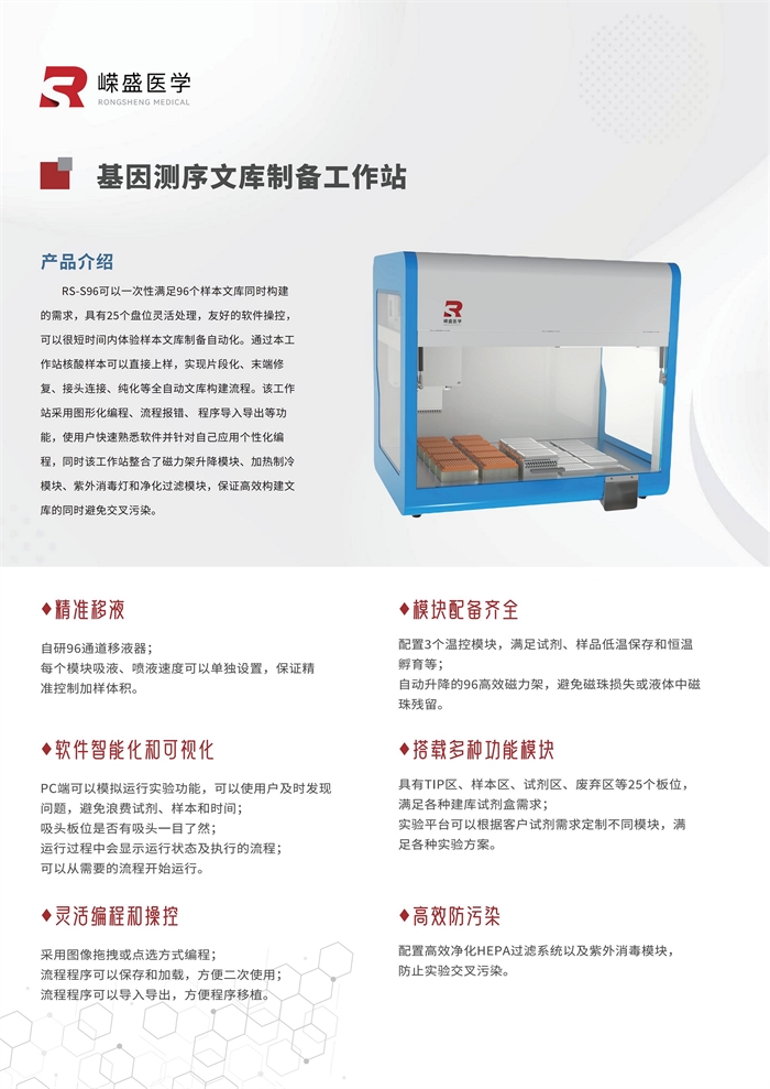 RS-S96可以一次性满足96个样本文库同时构建的需求,具有25个盘位灵活处理,友好的软件操控,可以很短时间内体验样本文库制备自动化。通过本工作站核酸样本可以直接上样,实现片段化、末端修复、接头连接、纯化等全自动文库构建流程。该工作站采用图形化编程、流程报错、程序导入导出等功能,使用户快速熟悉软件并针对自己应用个性化编程,同时该工作站整合了磁力架升降模块、加热制冷模块、紫外消毒灯和净化过滤模块,保证高效构建文库的同时避免交叉污染。