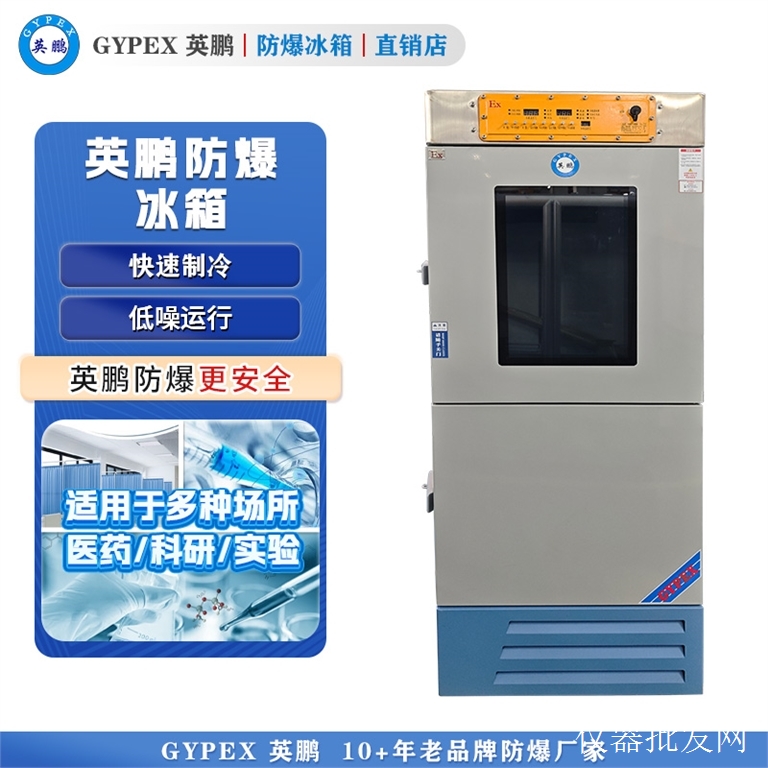 英鹏防爆冰箱主要应用在石油、化工、科研、实验室等领域,用于在较低温度下冷却储存药品试剂等常温下不易保存易挥发易燃易爆危险物品。它由制冷压缩机、冷凝器、冷凝器风机、蒸发器、温度控制器组成让其能在危险场所使用,我们同样采用复合防爆技术对冷柜进行防爆处理。压缩机、冷凝风机采用浇封或隔爆技术处理,温控器作为一个无源开关与防爆有源光耦固态继电器组成本质温度自动控制系统。为保护压缩机不致损坏,采用延时型防爆固态继电器和过载保护及热保护器件,部分控制电器采用隔爆处理。为了防止静电所带来的危害,对冷柜内腔喷涂导电漆消除静电效应。