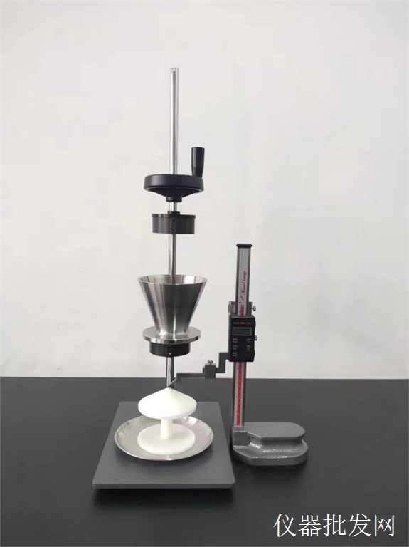 休止角常用的方法是固定圆锥法(亦称残留圆锥法)。固定圆锥法将粉体注入到某一有限直径的圆盘中心上,直到粉体堆积层斜边的物料沿圆盘边缘自动流出为止,停止注入,静止2分钟后测定粉体层的高度和圆盘半径,再通过软件自动计算而得。即tanθ=高度/半径。测量休止角的目的是通过休止角的大小来判断粉体的流动性,一般休止角越小流动性越好,休止角越大流动性越差。通过休止角的大小来判断粉体流动性好坏是最常用的方法。